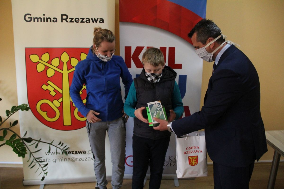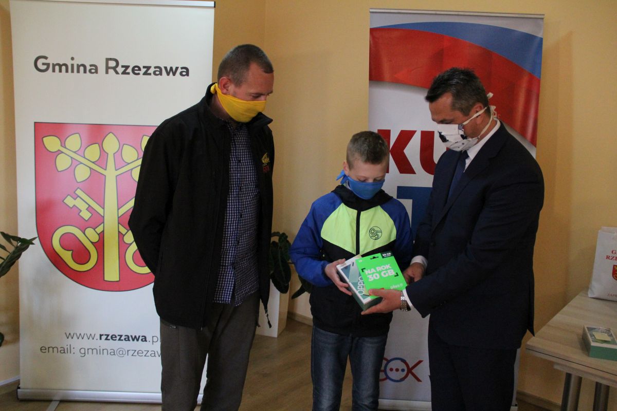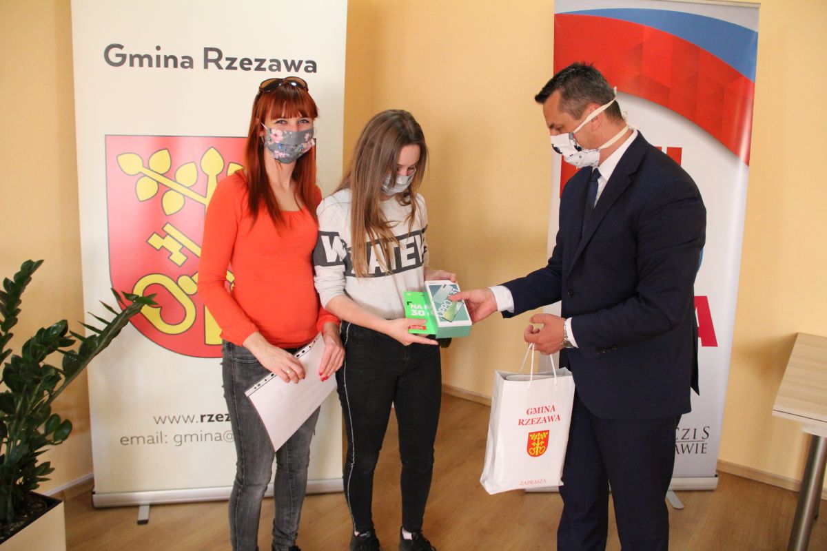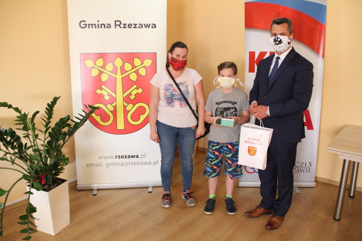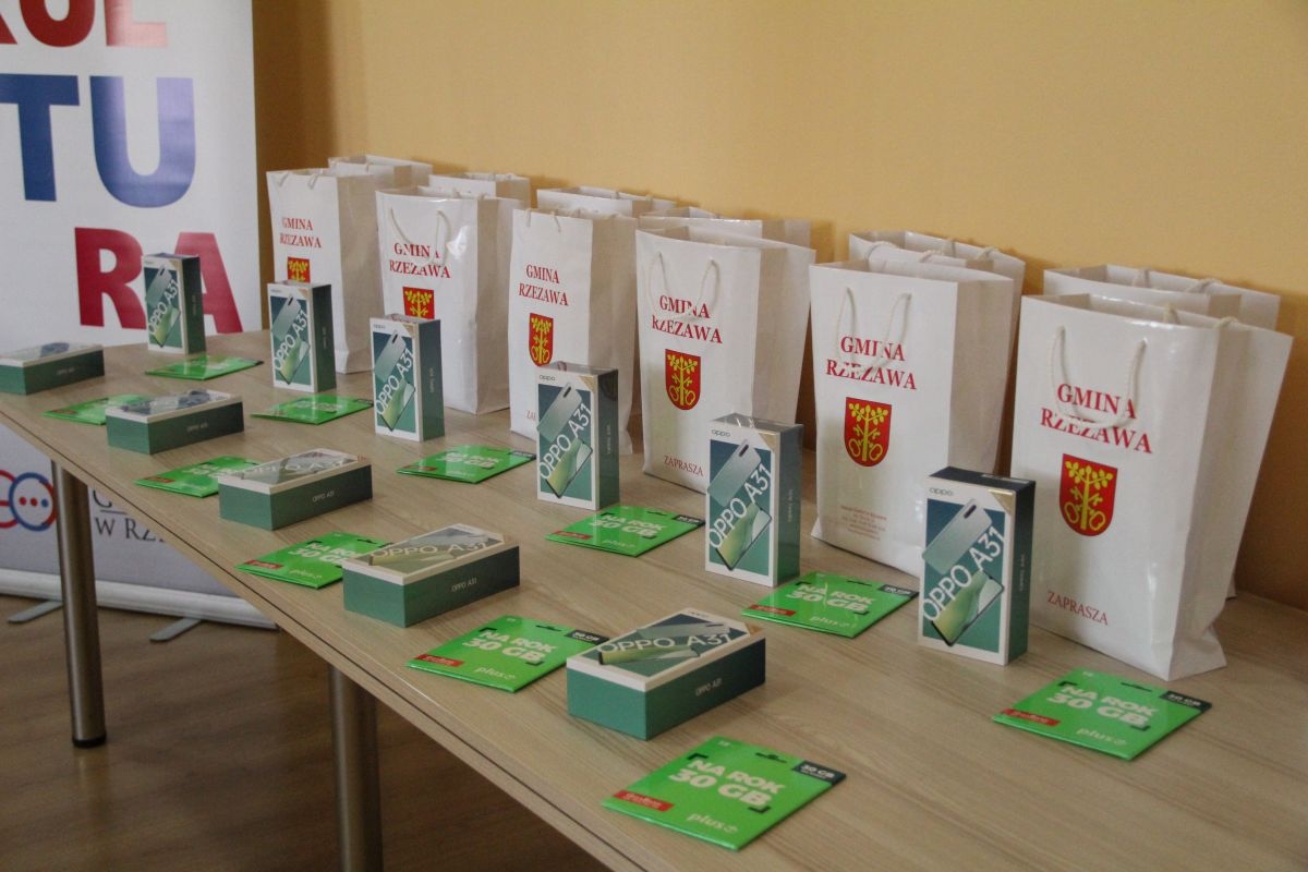 Smartfony zostały wręczone uczniom lub w przypadku ich nieobecności rodzicom dzieci przez Wójta Gminy Rzezawa Mariusza Paleja, który podarował każdemu także kilka drobnych upominków. Wśród nich były ceramiczne kubki, opaski odblaskowe, długopisy, smycze i bidony. Prezenty otrzymało w sumie czternaście osób: Kacper Giemza i Dominik Puzia z PSP w Borku, Dariusz Strózik i Gabriela Wygoda z PSP w Okulicach, Dominika Wolnik i Eliza Szydłowska z PSP w Rzezawie, Igor Surowy i Klaudia Strzyż z PSP w Krzeczowie, Oliwia Ścisło i Bartłomiej Piotrowski z PSP w Łazach, Nikodem Hajnosz i Szymon Wiercioch z PSP w Dąbrówce oraz Oskar Błaszkiewicz i Kacper Cisoń z PSP w Jodłówce.