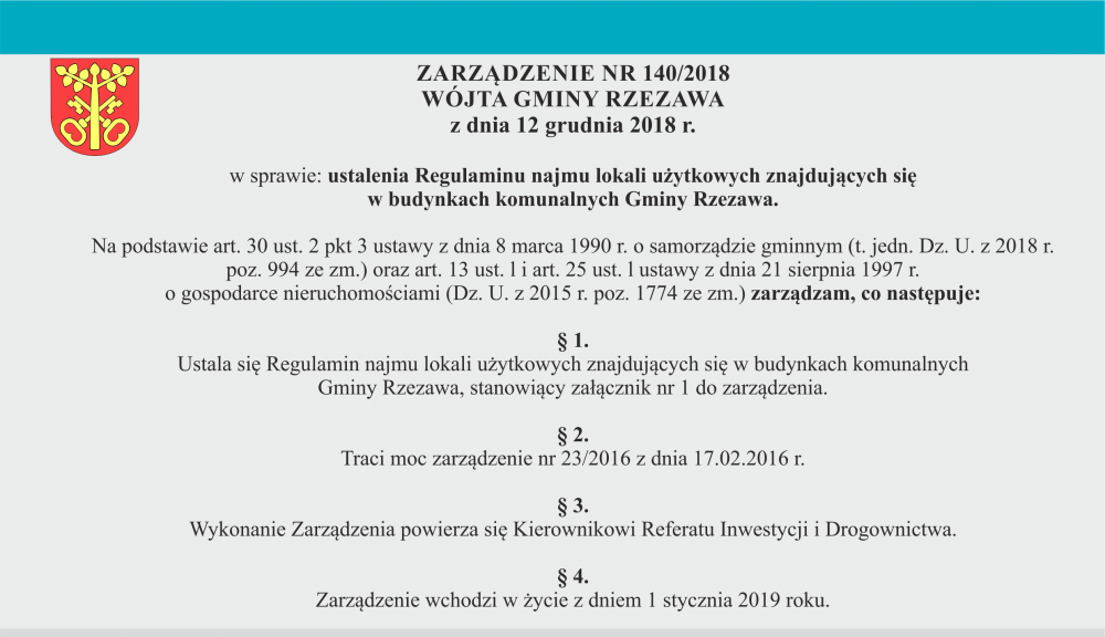 ZARZĄDZENIE NR 140/2018 WÓJTA GMINY RZEZAWA z dnia 12 grudnia 2018 r.