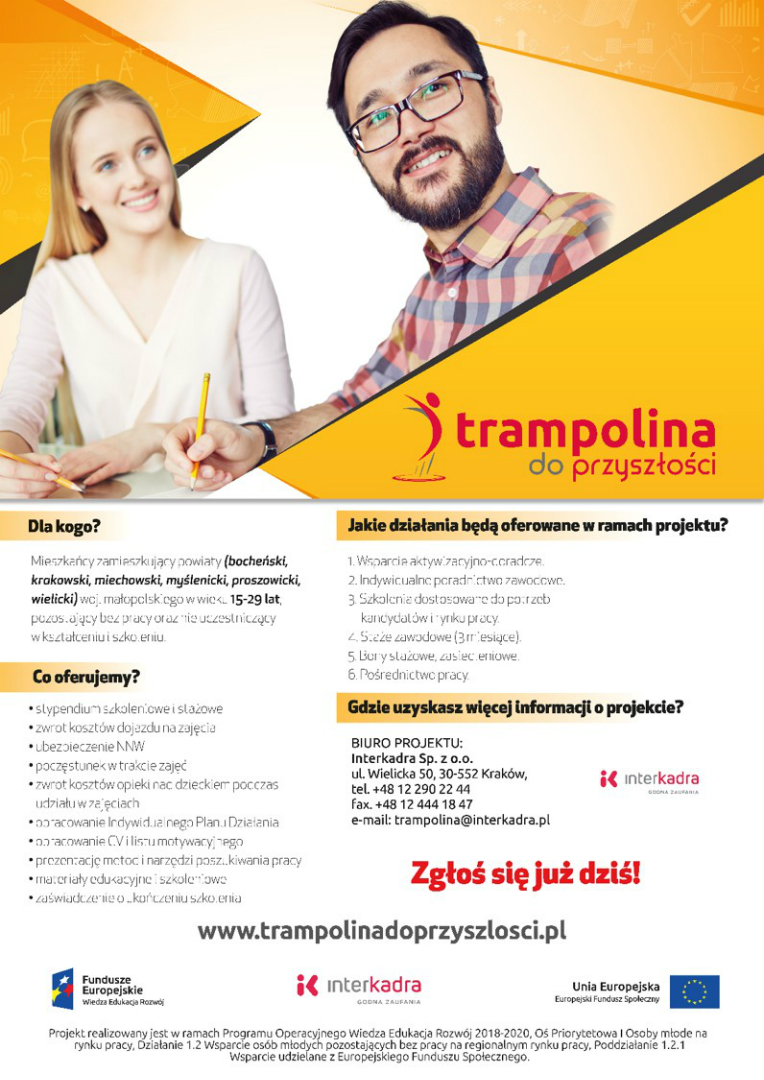 Zaprasza do udziału w projekcie „Trampolina do przyszłości”- program zwiększający możliwości zatrudnienia osób młodych” POWR.01.02.01-IP.15-12-006/17. Projekt realizowany jest w ramach Programu Operacyjnego Wiedza Edukacja Rozwój 2014-2020, Oś Priorytetowa I Osoby młode na rynku pracy, Działanie 1.2 Wsparcie osób młodych pozostających bez pracy na regionalnym rynku pracy, Poddziałanie 1.2.1 Wsparcie udzielane Z Europejskiego Funduszu Społecznego.