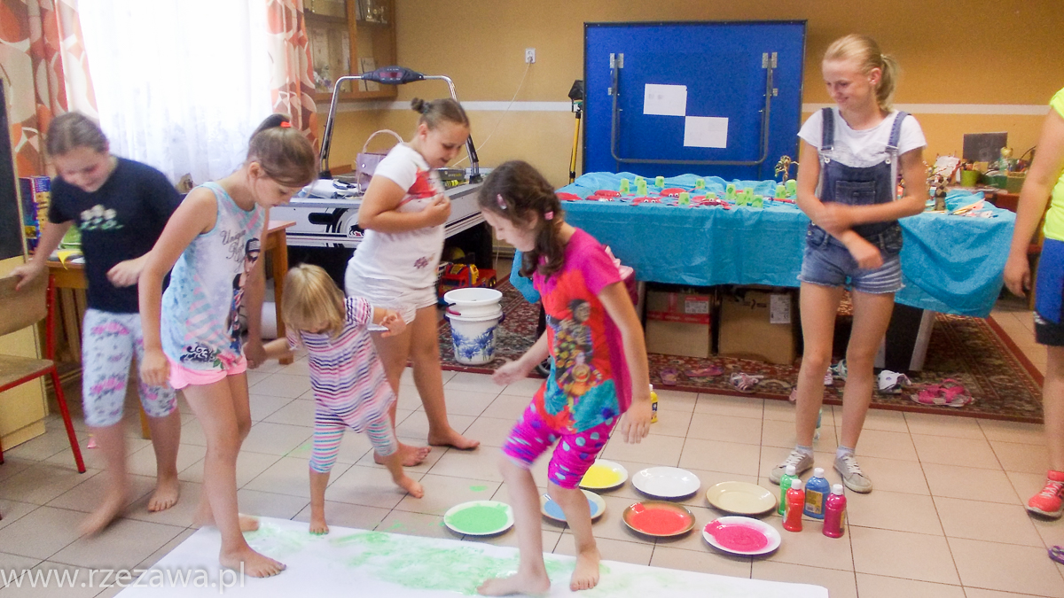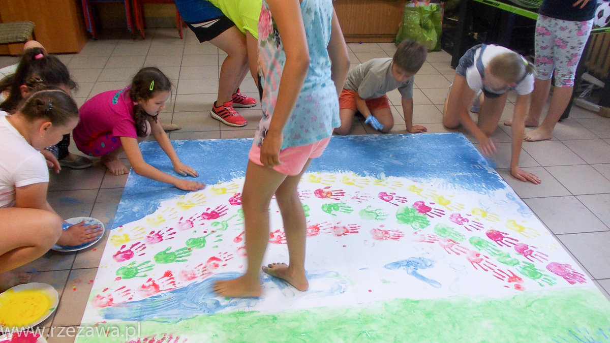 - wykonywanie obrazu „Szczęśliwy świat dziecka” (za pomocą stóp i rąk umoczonych w farbie),